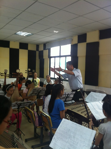 9月21日上午,正当大家沉浸在中秋小长假的节庆气氛中,奉贤区青少年活动中心学生民乐团的孩子们却早早地来到了排练厅,因为今天,他们将和自己的“新师傅”们见面。对于这支学生民乐团,青少年活动中心的领导可谓不遗余力,除了安排活动中心4位教师常任执教外,还聘请了区文化馆、市民族乐团的演奏家们每周前来执教,更力邀市特级教师、民乐专家曹建辉老师定期来指导。课堂上,正在排练着刘小剑老师编写的民乐小合奏《茉莉花》,只见孩子们个个全心投入、意气风发。可以看到,在经过前期的10余次训练后,他们在演奏技巧、协作能力和团队意识等方面都有了显著的提高。