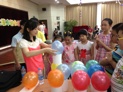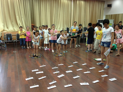 ????7月的户外烈日高照、热气袭人,但每次活动的现场都是人头攒动,充满了欢声笑语,队员们参与活动的热情绝不亚于室外的高温。本次活动中涉及的游戏有考验队员团队配合及协调能力的,如:“共垒健身塔”、“脚连脚心连心”等;还有结合宝山区创建国家卫生城区的中心工作,特别设计的有关环保、垃圾分类等主题的游戏,如:“我是小小打捞工”、“环保‘拼、拼、拼”、“小垃圾大讲究”等。大家在少年宫老师精心准备的游戏中玩得不亦乐乎。
