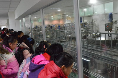 在养乐多生产基地,大家首先观看了一段生动的动画片,增长了许多关于乳酸菌的知识,还了解了乳酸菌到底对人有什么益处。接着,在讲解员的引导下,同学们进行了知识抢答:“养乐多里到底有多爱少个有益菌?”“有益菌对我们的成长有哪些益处”……通过这一系列问题的抢答,大家对养乐多及有益菌有了更进一步的认识。随后,我们在讲解员的带领下,沿着专为参观者特别预留的通道——“参观通道”,参观了养乐多制作车间,在那里,大家透过透明的车间窗户,近距离地看到了养乐多从菌种培养、发酵过程、调和、容器的成形、充填、包装直至入库的整个生产流程,对一瓶瓶养乐多是怎么生产出来的有了更直观的认识。