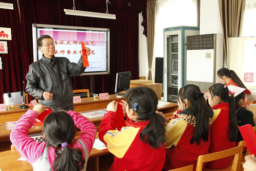 整个活动由市、区名师何球红老师主持。江海第一小学朱权华校长向与会者介绍了学校纸艺课程的开发与发展历程,尤其在彰显学校特色项目上作了详细的介绍。华兴富为江海一小送来他精心创作的马年作品,并当场指导大家撕“春”字,感受其中的魅力。
