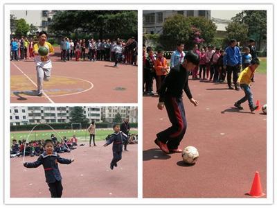 学校自2012年起设计阳光体育五会课程——围棋、跳绳、踢毽、打篮球、踢足球,经过一年多的研究、修改,在2013年完成了对体育五会内容和评价标准及方式的方案设计。并在第一学期上半年完成学生“成长的足迹”记录册的编印工作,目前每个孩子都有一本。本学期开始,体育组的各位体育教师已经将“体育五会”的教学内容和评价标准及方式放入日常的课堂教学中。为了更好地落实体育五会的普及工作,检验实际教学效果,学校体育组和大队部结合利用中午时间开展学生阳光体育五会竞技。每天中午安排一个年级,以班级为单位,每个班级选派5男5女进行比赛。比赛分设一、二年级一分钟跳短绳,三年级足球绕杆,四、五年级篮球接力。