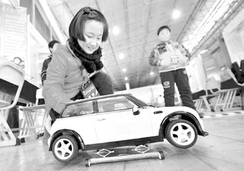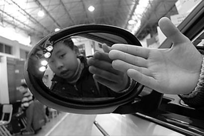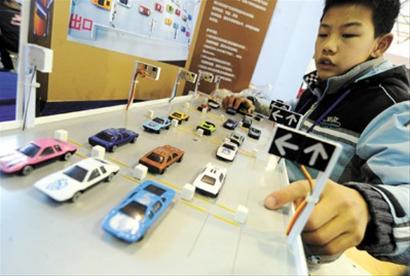 ?一位参赛者在科技创新大赛上展示自己研发的汽车车门安全开启装置