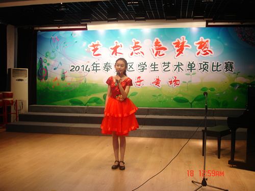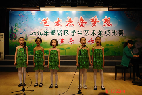5月18日,春雨绵绵,空气显得无比纯净。奉贤区青少年活动中心多功能大厅的舞台犹如一个百花园,鲜花绽放,多姿多彩。这里正在举行“艺术点亮梦想”2014年奉贤区学生艺术单项声乐专场的比赛。来自全区中小学近一百名选手参加了本次比赛。比赛分小学组、初中组、高中组三个组别进行,演唱形式分独唱和重唱两种。