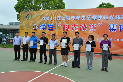 5月24日,由奉贤区教育局和奉贤区体育局主办、奉贤区中小学生体育协会承办的“2014年奉贤区学生阳光体育大联赛小学生‘阳光伙伴’集体跑比赛”在奉贤中学篮球场鸣枪举行。来自全区40所学校的55支代表队的1760多名小运动员参加了比赛。区教育局党委副书记、区中小学生体育协会会长张杰、副局长唐瑛等领导出席了此次活动。