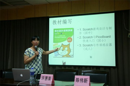 首先,台湾佛光大学资讯应用学系许惠美教授带来了“台湾Scratch教学推广与研究经验分享”主题演讲,给现场的教育工作者普及了什么是scratch以及许老师本人在scratch与机器人领域相结合所做的一些尝试。对于青少年教育工作的开展非常有启发。