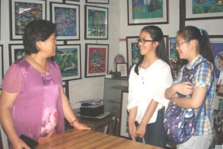 实践活动的第二站是参观金山农民画村,艺术团的两位团员的课题就是《金山农民画》,所以就由她们做向导,我们见到了农民画家曹秀文老师,她再次很热情地接受了团员们的采访。