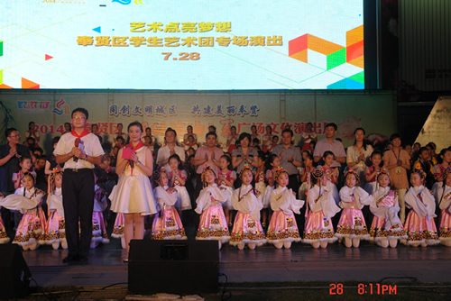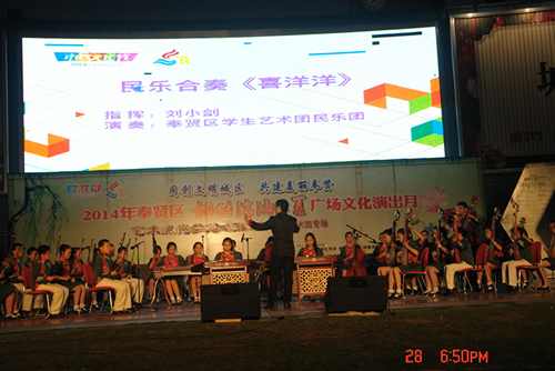 7月28日晚,在奉贤区文化广场,区青少年活动中心承办了“艺术点亮梦想”——2014“相约滨海之夏”学生艺术团专场演出活动。区教育局党委书记陆琴、局长陆建国、党委副书记张杰、党委委员何亦乐、纪委书记洪德福、副局长唐瑛、区文广局副调研员郑建宁、区教育局办公室主任王英、基教科科长朱银莲等领导观看了演出。
