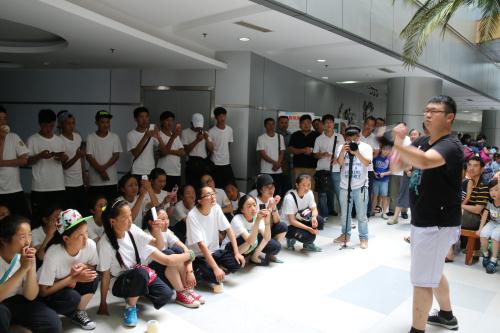接下来,教你玩俱乐部的“飞碟杯”和“溜溜球”项目也吸引了许多同学们好奇的目光。你看,那小小的溜溜球在几位教你玩俱乐部学员的手中变化多姿,让人目不暇接,惊叹不已。“飞叠杯”本来就是一个很普通的杯子,但是通过他们的组合,杯子就换成了另外一副模样,产生了不一样的价值。远道而来的客人一边惊叹于同学们娴熟的技术表演,一边努力学习,也尝试着转动手中的杯子和溜溜球。整个底楼大厅洋溢着幸福、和谐的气氛。