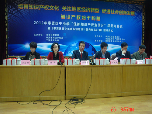 4月26日上午,由奉贤区教育局、奉贤区知识产权局、工商奉贤分局联合主办、奉贤区青少年活动中心承办的以“培育知识产权文化,关注地区经济转型,促进社会创新发展”为主题的“2012年奉贤区中小学‘?;ぶ恫ㄐ隆疃皇紧摺斗钕颓嗌倌晟瘫甏匆馍杓朴判阕髌坊惚唷吩橐鞘健痹诜钕颓恫ň致≈鼐傩?,上海市科技艺术教育中心领导及专家、各区县知识产权教育分管领导及专家莅临现场观摩?;嵘戏钕颓逃痔歧本殖ぷ髯ㄌ夤ぷ鞅ǜ?,市知识产权局洪涌清副局长作重要讲话,他肯定了奉贤区学校知识产权教育工作所取得的成绩,并且对奉贤区在知识产权教育活动中所开展的“青少年商标创意设计”特色活动给予了高度评价,并要求学校继续积极探索知识产权教育工作模式,勉励学??萍几ǖ荚奔绦勾丛旖逃睦绦渡泶葱率导?。而后,活动分成两块,一是“奉贤特色产品”青少年商标创意设计优秀作品创意说明及专家讲评;二是市、区领导及知识产权(创造发明)中心组成员工作研讨。我们相信,通过本次活动,奉贤区青少年保护知识产权活动必将走上更高台阶。