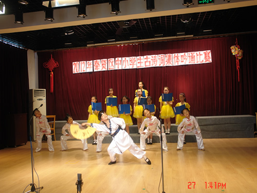 ?? 4月27日下午,由奉贤区教育局主办、奉贤区青少年活动中心具体承办的“2012奉贤区中小学生古诗词集体吟诵比赛”在奉贤区青少年活动中心举行,全区共有39所学校的400多名学生参加了本次比赛。经过激烈的角逐,育秀实验学校、汇贤中学、南桥小学、江海三小、教院附小将代表奉贤区参加市级比赛。
