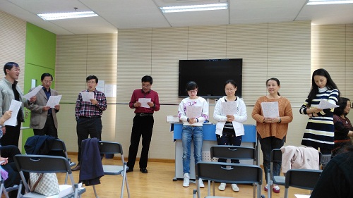 11月7日上午,在青少年活动中心剧场合唱厅里,传出阵阵训练有素的练声。全体学员跟着钟瑞玲老师的节奏,进行气息训练,这是校本培训《声乐艺术鉴赏与演唱》的第一课。