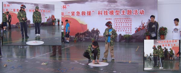 本次活动吸引了普陀、闵行、浦东、静安、崇明、嘉定、松江、长宁、黄浦、宝山等10个区县的100多所中小学720名中小学生参加。在“紧急救援”比赛现场,每个参赛队的选手头戴安全帽、身着迷彩服、在红十字袖章的特殊标志下进行比赛,在80平方的场景模型中展开以营救生命为第一要素的科技模型救援活动。比赛中,各区的运动员充分展示自己的遥控技艺,直升机起降迅疾、定点明确,运动员操作娴熟、救护伤员到达指定区域。 ?