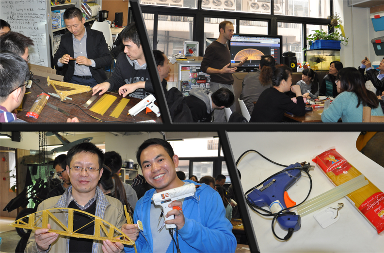 老师们需要通过手脑并用与团队合作,用一袋意大利面和三支热熔胶进行桥梁设计制作,并参与最终的大比拼,看看哪组的桥梁沉重能力最强。最终,结合了拱形结构和三角形结构特点的一组桥梁设计,集美观与结构功能为一体,将承重能力强化到最优,超越所有其他组的成绩并且保持桥梁完好无损,击败了所有对手。