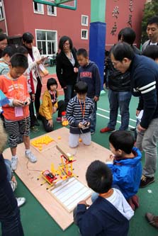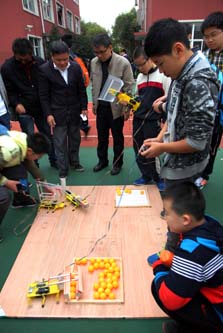 遥控机器人点球比赛现场也是扣人心弦。比赛要求机器人从起点出发,在规定4分钟时内,连续完成5个球的射门任务。只见比赛选手手持遥控器,高度紧张,一旁的指导老师也紧紧盯着机器人和足球,现场指挥:“靠近,靠近,好,稳住,稳住,准备,进!”谈到怎样才能使机器人进球几率高,来自东华大学附属实验中学的钟老师说:“就像打枪一样,最重要的是人、球、球门三点一线。越是接近球门,越要慢点走,有耐心,看准了一击即中!”