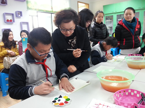 二是观摩两位骨干教师精心准备的工艺活动课,一节是严爱明老师的《装饰杯子》,一节是孙卫红老师的《“玻璃”版画》,他们分别结合班上学生的能力特点,用简单易懂的语言,和特殊孩子们近距离的互动交流,激发他们的学习兴趣,挖掘他们的想象力和创造力,有效提高他们的动手能力和对艺术美的欣赏能力。课后,一幅幅充满童趣且富有想象力的作品呈现在各位听课老师的眼前,大家无不表露出赞美之意。孩子们拿着自己亲手完成的作品,送给了前来听课的老师们,让爱溶于大家的心田。