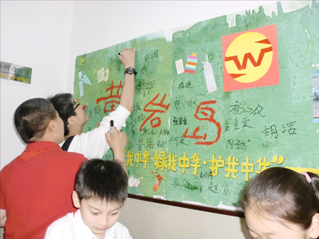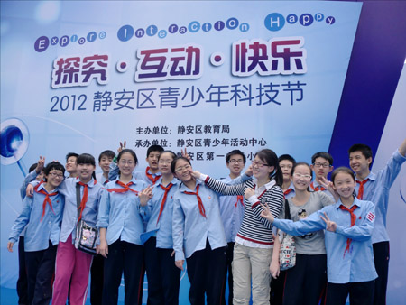为了更好地宣传与推进低碳环保的理念,在5月12日静安区青少年科技节上,五四中学推出了以“纸变”为主题的‘爱我中华、绿我中华、护我中华’实践活动。此活动原引于同学们喜爱的游戏“植物大战僵尸”,请现场小朋友们利用提供的各种废弃旧纸张,开发、开拓自己的想象力、创造力及动手操作能力,来完成一件件植物作品(也可做其它),来保护自己的美丽家园——黄岩岛。在校领导的直接参与、七年级4班杨心仪、何度等六位同学的创新努力下,我校黄岩岛签名活动及制作现场,得到了与会各校中小学生的积极响应与倾心投入,其受亲睐程度可用四个字形容——火热、爆满!区教育局局长陈宇卿、区教育党工委书记孙明丽、副局长戈一萍等领导们也与同学们一起欣然地在中国黄岩岛签名栏上郑重地签上了自己的名字,以示涓涓爱国情、拳拳赤子心,那一刻、那一瞬间,中华力量在集结,中华儿女在宣誓:爱我中华,护我中华。