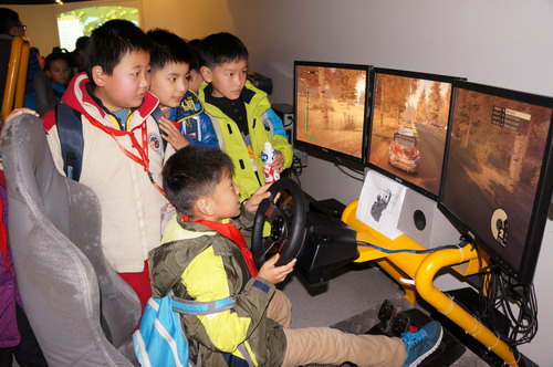 活动第一站,来到上海汽车博物馆,同学们参观探索与诞生、多样与精彩、运动与驾驶、节能与电子、中国汽车工业、未来之路等9个主题展区,了解汽车诞生的历史故事以及中国汽车的发展历程,观摩人类渴求力量与速度的每一个重要印记,学习“汽车改变世界”的百年文化精髓;学生们最喜欢的是博物馆三楼的汽车探索馆,这里不仅有对于汽车的基本知识图文和多媒体介绍,更有配套的触摸屏和智力问答器模拟操作。学生们在讲解员的指导下认真学习各种交通标识;在电脑中点击自己喜欢的车辆设计图;在模拟车辆上进行模拟驾驶……感受人类追寻“神行”的理想和人类探索创新的智慧和激情。