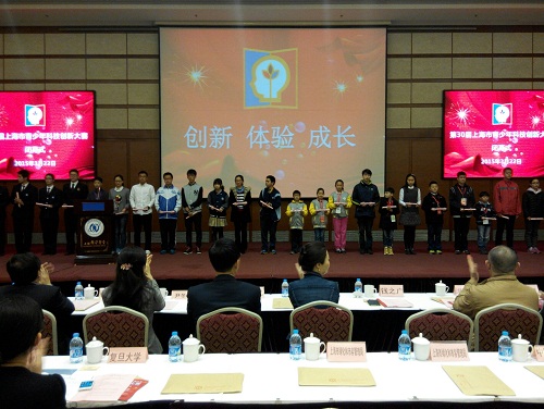 会上近千余名“科技精英”集结一堂,一起回顾了本次大赛的全过程。对于他们来说昨日的鏖战历历在目,当看到自己出现在大屏幕上,总抑制不住激动的心情。会上除了颁发对此次活动作出杰出贡献的单位和学校外,还颁发了大会主席奖,全市仅两位同学获此殊荣。当大会宣布获市一等奖并选送全国的学生名字时,会场沸腾了,大家纷纷为上台领奖的学生热烈鼓掌,他们将代表上海市参加今年8月在香港举行的全国创新大赛,希望他们再接再厉,再为上海队勇夺金牌!