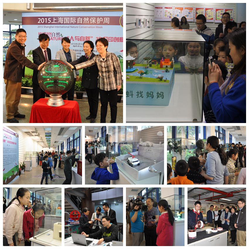 4月18日, 2015上海国际自然保护周——“人与自然”3D打印创意大赛作品展,在静安区青少年活动中心揭开了神秘的面纱,50件精选出的优秀作品向公众亮相,同时展开投票评选活动。上海市教委体卫艺科调研员丛海鹰、市科委科普处处长朱翯、上海产业技术研究院主任闵国全、静安区科委主任林晓珏、静安区教育局局长陈宇卿共同启动展览,静安区科委、区教育局、区科协领导参加了启动仪式。展览将持续到4月24日,期间组织专家评审,获奖作品将在静安区科技活动周、静安区青少年科技节同步展出并进行表彰。