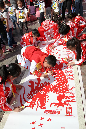 奉贤区江海第一小学“灵动撕纸团队”代表奉贤区青少年活动中心参展,在区青少年活动中心封惠平书记和江海一小朱权华校长带队下,以“祥龙齐飞? 展望未来”为主题,采用“我们都是龙的传人”的形式,用撕纸艺术来话说现代中华儿女的生活故事,以表达对美好生活的追求和对未来发展的期望。在整整一个半小时的师生齐心协力下,两条祥龙以东方明珠建筑群为中心,腾空飞起在长卷的上端,六个单元创作活动分别展现了奉贤少年放飞梦想、庆祝黄桃丰收、快乐的校园生活、和谐的家和祖国未来的美好祝愿,展现了对中华五千年传统文化的深厚情感、表达了从小立志为我国社会主义文化强国建设作出贡献的豪情壮志。作品得到了在场领导、嘉宾、记者朋友的啧啧称赞,成为此次百米长卷团队主题画展演活动亮点之一。奉贤区青少年活动中心获得“最佳创意奖”;青少年活动中心和江海第一小学获优秀组织奖。