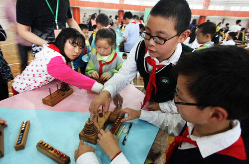 比赛现场,学生充分发挥自己的想象力、创造力以及动手能力,按年级段用自己的方式完成T字之谜、索玛立方体、狭路相逢、拆装孔明锁等项目赛题。