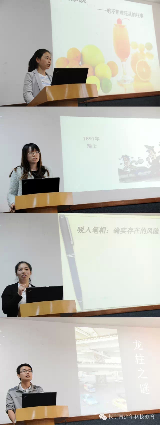 活动中,教师们充分发挥个人优势,声情并茂地演绎着每个故事。惠诚老师用详实的客观数据带出了一个马桶圈背后的理性分析;谢昊老师利用自身美术特长,清晰明了的介绍了风衣的历史;陈宏宇老师声音铿锵有力,将当下各大领域的时尚宠儿——3D打印技术展现在我们面前;许一老师则从学生的作品出发,向大家介绍了连锁机关装置的鼻祖——鲁布戈德堡;陆蔚老师借用道长的故事将白磷的神奇效果进行了解密;彭慧慧老师则如邻家女孩一般,将柑橘家族的复杂关系在娓娓道来中理清;盛洁老师选取了电影《速度与激情7》的惊险画面,从科学的视角对其进行了分析、诠释 ;蔡雯曦老师和张琳老师则不约而同的从生活中常见的物品出发,将由围裙引发的发明和笔帽上的小孔背后的科学道理讲明;最后,梁起老师拨开层层迷雾,为大家揭秘龙柱的奥秘。青年教师们悦人的声音,丰富的表情,动人的表演,深深吸引了在座的教职员工。