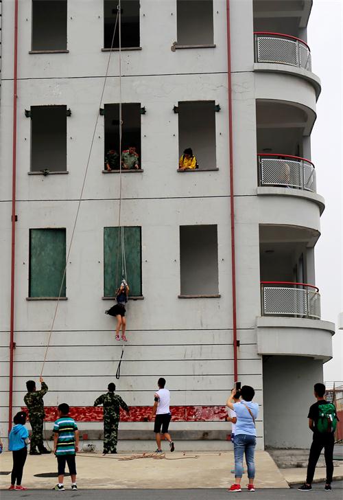 整个过程最激动人心的还是体验高楼逃生,消防官兵让小营员们玩模拟高楼火灾高空索降的游戏,男孩子争先恐后地报名参与,当然女生们也不甘示弱体验了一把高空降落。就在大家玩得正开心的时候,突然楼道里烟越来越浓,伸手不见五指,教官告诉营员们所在的大楼着火了,于是,营员们右手扶着墙壁,左手搭在前面同学的肩上慢慢往前挪——终于见到光明了!短短地几分钟让营员们感受了生命的珍贵!