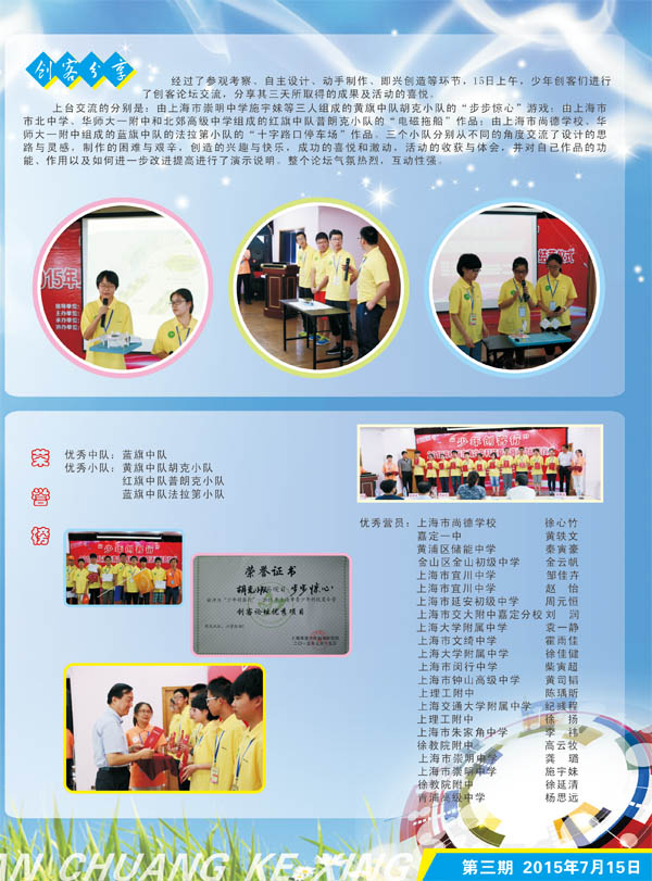 为更有效地引导学生暑期中走出家庭,体验创客,拓展视野,由上海市科技艺术教育中心、上海市青少年科学研究院、上海创客教育联盟主办、崇明县青少年活动中心、上海市青少年科学研究院崇明分院承办的 “少年创客行——2015年上海市青少年科技夏令营” 7月13日在上海市科技艺术教育中心隆重开营了。来自上海市各区县100多名对科技创新及创客具有浓厚兴趣的初二至高二年级的科技爱好者们开始了他们满心期待的创客之旅。