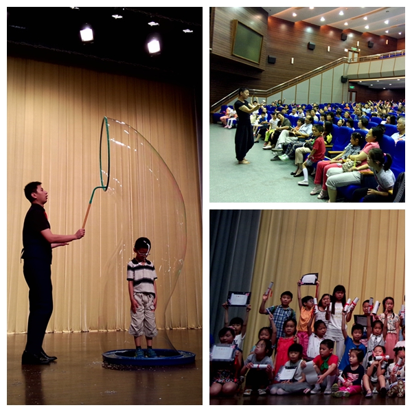 活动邀请静安区街头艺人和魔术师,表演了魔术、魔幻圈、水晶球和泡泡秀等节目。近两个小时的演出,动静结合、生动活泼、丰富多彩。其中有观赏、有互动、有学习、有游戏。孩子和家长把整个剧场坐得满满当当,充满了期待。他们不仅有机会上台和魔术师一起完成表演,还能从他们那里学上一招,让两根普普通通的吸管变出“魔力”。掌声响起来,荧光棒挥起来,双手举起来,现场的高潮一阵高过一阵。最受欢迎的泡泡秀,孩子们跑上舞台前的空地,追逐着五彩气泡,甚至钻入魔术师变出的大泡泡中。这一个环节,异常精彩,给所有小朋友留下了深刻印象,把整场活动推向欢乐的顶点。