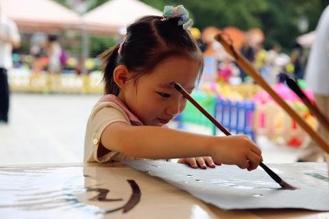 参与“中秋写月”环节的孩子们挥毫泼墨,在老师的指导下用毛笔书写篆、隶、楷体的“月”字,了解“月”字的书写演变进程,完成了一个个苍劲有力的“月”字;“月饼工坊”、“七彩花灯”环节集趣味性、动手能力和创意性为一体,让孩子在制作的过程中充分调动感官和手指的协调,家长们也纷纷参与其中,与自己的孩子一同动手,亲手完成一件件精美的手工作品。孩子们很开心在集体活动中有爸爸妈妈的陪伴,共同体会传统文化节日的欢乐气息,少年宫中回荡着一片欢声笑语。