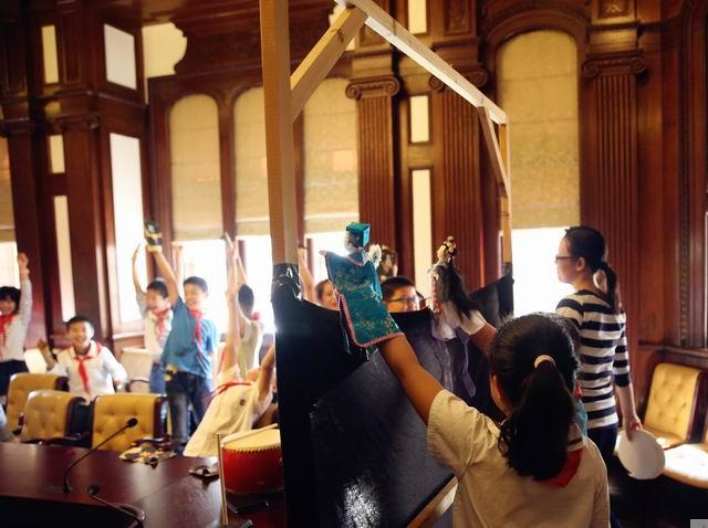 闽南方言向台湾的流播,集中地体现了闽台方言的渊源关系,从而显露了闽台之间共同而又深刻的文化内涵。同学们在学唱童谣《TiWoWo》的过程中,饶有兴致地跟着老师一字字模仿着闽南语的发音,并结合童谣中的情节戴上斗笠融入到情境演绎中;舞蹈《高山青》和鼓乐群英会则让同学们领略了能歌善舞的台湾原住民独特的风土人情;在工艺风狮和黑熊手偶制作环节,同学们大展身手,发挥奇思妙想,享受着自己动手DIY的乐趣;而更让大家欣喜的是,自己做的黑熊手偶还在之后参与的布袋戏体验中,成为了戏中的一个重要角色。同学们套着亲手制作的手偶跃跃欲试,一场来自于“戏剧之乡”福建的布袋戏在少年宫红花楼的教室里鸣锣开演。黑熊手偶与布袋木偶同台“飙戏”,传统与现代和谐并存,这一场布袋戏更实现了闽台文化的聚合。