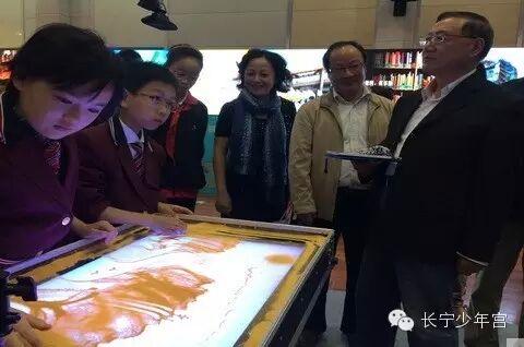 书画教研组的现场展示尤其成功:学生沙画表演广吸眼球,开场前沙画师生就接受了上海教育电视台的采访。表演中市领导驻足欣赏,教育部艺教委秘书长谷公胜、上海市中小学幼儿教师奖励基金会常务副理事长李骏修都特别慰问和赞赏。书法展区在书画教研组第二副组长丁卫国老师的带领下,校外书法名师们现场泼墨挥毫。嘉宾上海市政协港澳台侨委员会办公室主任、著名书法家陈鹏先生即兴题字更使活动达到高潮。所有现场的老师收获良多,一致认为这次活动既是展示也是分享更是学习!