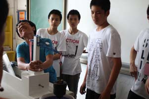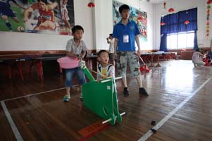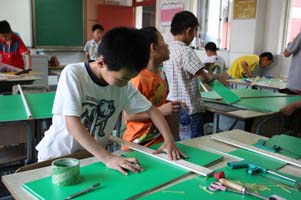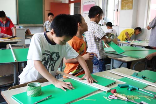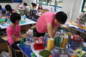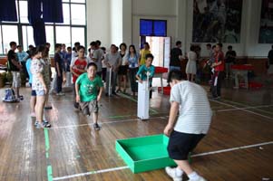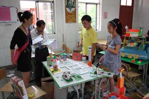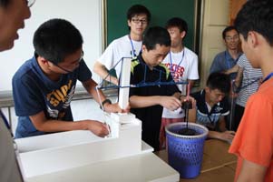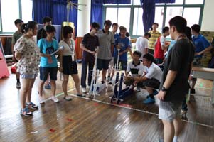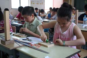 “我的发明故事”是要求参赛的学生以小品表演的方式展示自己的科技小发明,表演舞台上的同学们用活泼可爱的小故事展现出充满着创意,构思巧妙的小发明。“魔力手杖”、“巧乐刷诞生记”……,一个个精彩的表演体现了创造的无穷魅力。在动手制作现场,各小组的同学们团结一致,精心设计,力求自己的装置能够做到最好。投石机设计的参赛队要求使用纸板、橡皮筋等材料,再现这个古老机械的风采,制作完成的投石器需要通过投出沙袋的距离决出胜负。吊塔制作则是看看谁的吊塔吊起的重量最大。尽管天气炎热,可是参赛的同学们已经完全投入到这场竞技游戏中,反复测试、改进着自己的制作,充分享受着动手动脑带来的乐趣。