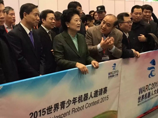 大赛的第二天,国务院副总理刘延东参观了世界机器人大会。她来到2015世界青少年机器人邀请赛的决赛现场,观看了全部四个赛项的比赛,并和场内侯赛的各国青少年选手做简单交流,并勉励青少年朋友们勇攀高峰,向人类科学前沿进军。