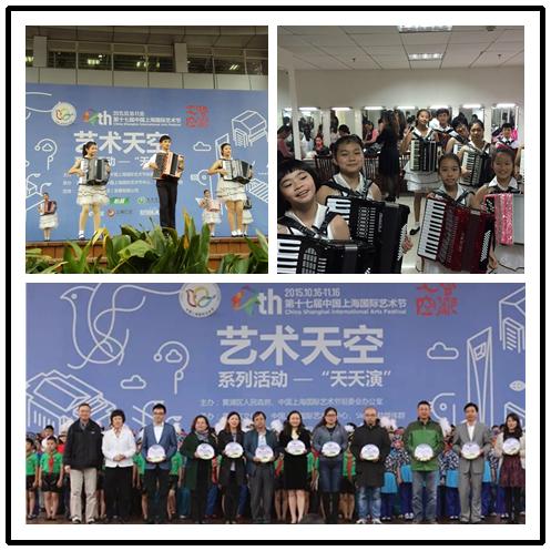 11月8日下午,第十七届中国上海艺术节艺术天空专长活动之一,“艺术成就梦想”——上海市学校少年宫优秀节目专场演出,在南京路世纪广场隆重举行。200余名来自全市学校少年宫的小学员代表,为现场500多名观众献上了一台精彩的表演,展示了学校少年宫教育活动的丰硕成果。静安区青少年活动中心手风琴社团的11名小学员,加入到这次的演出队伍中来,所带来的演出作品是配乐齐奏《晨曦》。这首曲子欢快活泼,充分展示了当代学生朝气蓬勃、神采奕奕的精神面貌以及积极向上的精神。