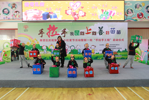 ??? 活动中还举行了新一轮奉贤区“蓝天下携手共进”手拉手活动启动仪式。“蓝天下携手共进”手拉手活动是奉贤少先队的一个品牌活动,自2008年开展以来,全区红绿领巾在星星火炬队旗的引领下,与需要帮助的小伙伴手拉手共成长,分享着纯洁的友谊和成长的快乐。当前,新时期新形势对手拉手活动提出了新的要求,在全国人民共圆美丽中国梦的历史进程中,在奉贤人民齐心协力巩固全国文明城区创建成果的热潮中,在全区少年儿童践行核心价值观,争当向上向善贤少年的活动中,奉贤区少工委进一步深化和创新手拉手活动,又有10所公办学校和10所民办农民工小学牵手结对。区红领巾理事会向全区少先队组织发出“爱心手拉手、快乐共成长”倡议书,徐露隽希望全区红绿领巾迅速行动起来,手拉手,心连心,时刻牢记党和政府的殷切期望,时刻牢记少先队的铭言,用实际行动践行社会主义核心价值观,让胸前的红绿领巾为美丽贤城增光添彩。