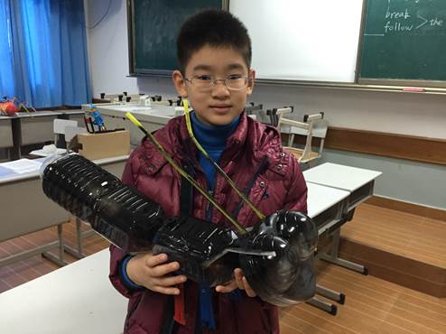 谈到创作的经历和收获时,小瑞祺更是兴奋得停不下来:“在老师的帮助下,我设计了电路图,并依照电路图用电烙铁焊接好LED灯泡、安上开关;接着又把在机器人班学到的马达动力系统建立起来,这其中找平衡点可是关键;然后把两套系统小心地植入到由巧克力盒,饮料瓶以及吸管组装成的蚂蚁框架里;最后调试好,就把它放到报纸上喷漆。”原来,李瑞祺这只勤劳的小蚂蚁已经接触到了化学、电子和马达传动的知识,加油,继续向前奔跑吧!