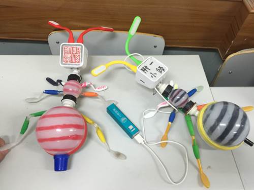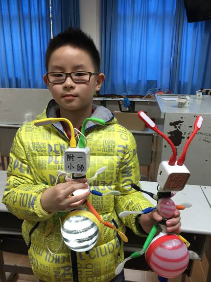 什么情况?对面静态组竟然也有两只蚂蚁,眼神犀利、霸气十足,早已蓄势待发:“我们可是超级蚂蚁组合!”这对蚂蚁利用废旧的走廊应急灯零件、LED灯罩、废牙刷、电脑用HUB等,并内置感应触发电路组成,显得精致灵巧。同样视蚂蚁为英雄的一师附小四(9)班的杨明泽同学,神采奕奕地展示着自己的超级蚂蚁:“大家使用电脑时经常需要有只USB的HUB,便于插入U盘等附件,超级蚂蚁就有这样的脑袋,而且还附带照明功能,方便实用。”它们究竟还“超级”在哪里呢?“蚂蚁的头部装有一片触控感应片,有它触发一只微型继电器来控制LED灯的开关。平时可以用手机充电器对内部镍镉电池充电,LED灯的发光效率高,实际上它们可以充当电脑灯哦!”
