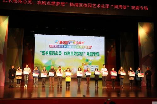 ??? 2016年1月19日下午,杨浦区第二十九届学生艺术节闭幕式暨校园艺术社团“周周演”戏剧专场活动在杨浦区少年宫梦想剧场举行。本次活动围绕“艺术照亮心灵,戏剧点燃梦想”的主题,集中展示了一年来我区戏剧节系列活动的优秀成果和精品节目。