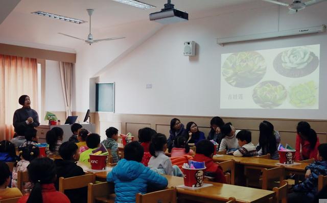 绿叶楼多功能里,老师正详细地向孩子们讲述多肉植物的知识内容,并带领孩子们观察着不同类型的多肉植物,有的是尖尖的、有的是圆圆的、有的是鲜艳的、有的是淡色的,孩子们聚精会神的关注着每一类多肉植物,生怕自己错过最精彩的部分。