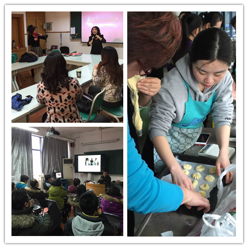 “哈哈……”一阵欢乐的笑声从烘焙坊传来。走近仔细一看,在我们烘焙坊吴老师幽默的指导下,每位教师都认真地做着自己手中的饼干,还时不时地比来比去,看看谁做得最好。烘焙坊不仅时时有欢乐,还阵阵飘香。每位教师都顺利地完成了自己的作品,在烤箱前如痴如醉地等待着自己的收获。来到艺术围巾课堂上,一块块普普通通的围巾,在杨老师的指导下,通过几个简单的打结,就像施了魔法一样,瞬间变成一件美丽的饰品,点缀在场的每一位教师。摄影是一门眼下时尚的课程,掌握好一两个摄影技巧对于教师而言非常重要。因此本次摄影课程吸引了众多教师前来参与。在课堂上,每位教师都聚精会神地听梁老师讲述摄影的种种小技巧。讲课之余,很多教师纷纷拿出自己的手机、数码相机、单反相机虚心地向梁老师请教。