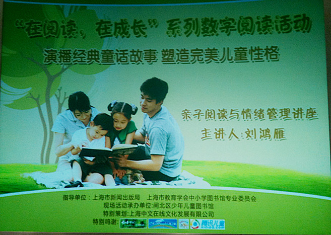2012年7月8日上午,由上海市新闻出版局、上海市教育学会中小学图书馆专业委员会指导,上海少年儿童图书馆主办、闸北区青少年活动中心,区少年儿童图书馆现场承办,上海中文在线文化发展有限公司特别策划的“亲子阅读与情绪管理”讲座在活动中心小礼堂举行。“共情”亲子阅读的创始人,幼儿教育专家、专业心理咨询师刘鸿雁老师携手闸北区青少年活动中心的青年教师金梦佳,现场演绎经典寓言故事,辅导家长如何进行亲子阅读和培养孩子的情绪管理能力。