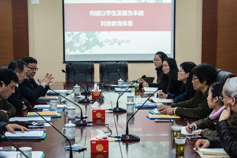 首先,分管“中心”科技教育的副主任王艳全面介绍了本市青少年科技教育的开展情况与青少年科技后备人才的培养体系。随后,科技教育工作者们通过各种活动案例介绍了现阶段上海青少年科技教育发展和成果,特级教师葛智伟老师特别着重介绍了上海开展创客教育的情况。陈德铭会长仔细聆听,并对“中心”在全市青少年科技教育工作中作出的成绩予以充分肯定。