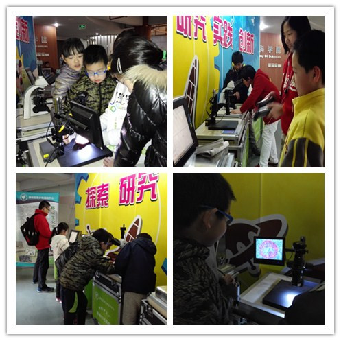 瞧!前来体验的同学正在使用显微镜、放大镜、PM2.5探测仪等科学仪器,开动小脑筋开展分析研究咯!比如:通过显微镜走进微观世界,揭开微观世界的神秘面纱;牵着爸爸妈妈一起测心率,比较成人和小朋友心率的差别;可以用放大镜看看手上是否有灰尘;可以身边的测噪音;可以测你所喝水的pH值,还可以在这里识别昆虫、植物、鸟类等……