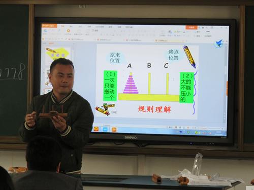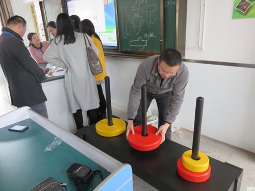 包含图感类、结构拼搭类、逻辑思维类、和解锁类4大类型的学习包益智类玩具,不仅激发学生的浓厚兴趣,也点燃了现场培训老师的操作热情。学习包中“T字之谜”、“破碎的心”、“破碎的蛋”图感类学具,把老师们带回了童年时玩七巧板的记忆中;“双龙戏珠”、“三角扣”“MW扣”的解锁类学具,让教师们在摆弄、操作中想象着魔术的魅力;“幼儿数独”、“数字魔方”、“五色土”、“夺王游戏”、“数独游戏”的逻辑推理类学具,则把老师们带入了乐趣无穷的数学王国中;而大型学具“汉诺塔”的解读,把整个活动推向高潮。“汉诺塔”是由三根杆子A,B,C组成的。A杆上有N个(N>1)穿孔圆盘,盘的尺寸由下到上依次变小。要求按下列规则将所有圆盘移至C杆:每次只能移动一个圆盘;大盘不能叠在小盘上面。为了让移动次数达到最小化,现场的老师们组团合作,有的在纸上模拟练习,有的直接在大学具上操作起来,有的在黑板上推论演示。每当合作团队完成移动时,大家都会聚集在一起研究、质疑、解惑,直至共同讨论出最佳方案……