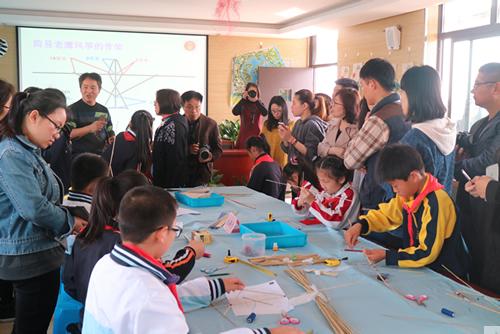 来宾们兴致勃勃地观看了学生们的风筝放飞表演,操场上拉着风筝线欢乐奔跑的孩子们吸引大家情不自禁地参与其中,愉悦的心情不可言语。随后大家一起观摩了该校教师周丽军的《简易老鹰风筝的制作》活动课。周老师从充满意境的古诗中引出主题,又将风筝的“四艺”——扎架子、糊纸面、绘花彩、放纸鹞等向大家细细阐述,学生们分组分板块向来宾们展示了各个环节的制作。学生们的娴熟技艺和学习热情使课堂充满了热烈欢快的气氛,来宾们也不甘落后,纷纷向小老师们请教,亲自动手实践一番。