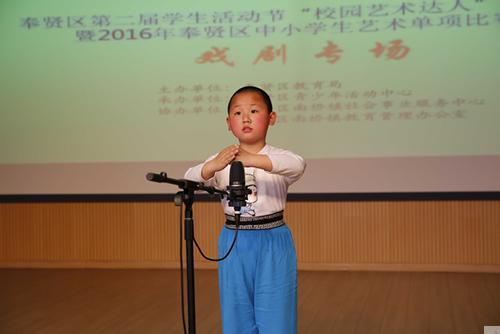 4月29日下午,奉贤区第二节学生活动节“校园艺术达人”选拔赛暨2016年奉贤区中小学生艺术单项戏剧专场比赛在区青少年活动中心多功能大厅举行。比赛分小学组、中学组和高中组三个组别。全区共有100多位学生62个节目参赛。