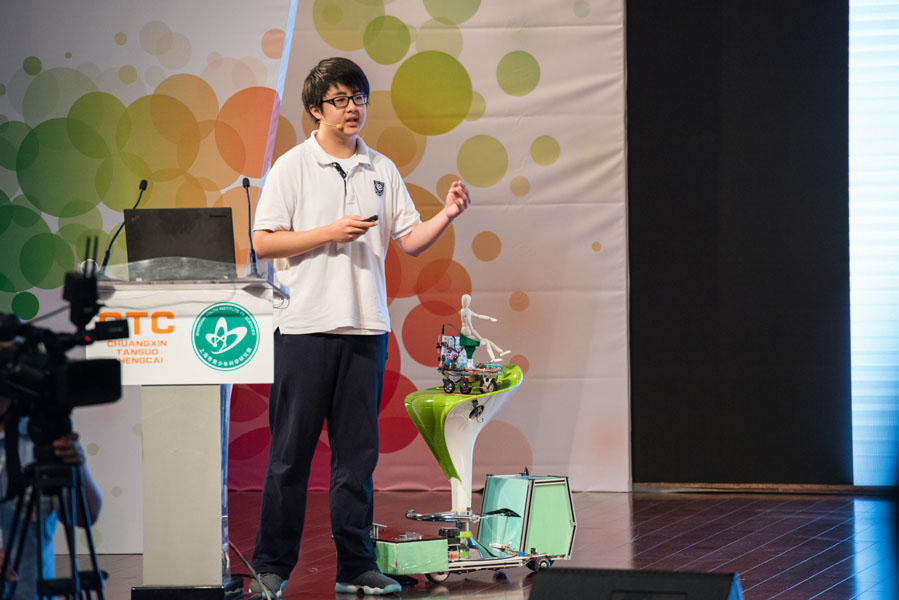 在主论坛——青少年科技创新论坛上,创新项目及科技创新社团的学生代表,向大家展示了他们源自于生活中问题的科技创新作品和科学研究成果,并与专家顾问们一起进行交流研讨,共话创新。来自华东师范大学第二附属中学附属初级中学的吴亭欧同学关注社会老龄化问题,研究并展示了他的创新成果《基于老年人生活数据采集的智能居家养老监护与快速报警系统》;上海西南位育中学高兴同学酷爱动手制作,他为大家展示了独特的《双模式控制的电动工作椅》。来自上海交通大学的杨皓天、蔡文怿同学为大家带来上海交通大学MDH创客空间的精彩介绍及他们的创新创业之路。市青少年科学研究院的顾问们给予了他们精心的指导和热情的鼓励。