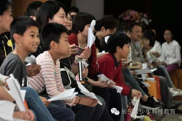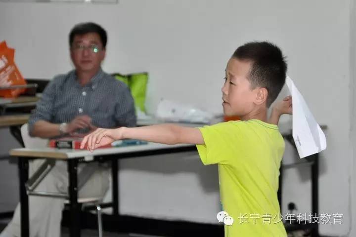 ??????? 小小一方A4纸,秀出创意无极限。纸飞机竞距赛的现场,学生赛得如火如荼,家长也不甘示弱。不剪,不撕,不粘,为了让纸飞机飞得更远,小选手们使出了浑身解数。每当有纸飞机飞得远时,现场总会响起一片称赞声,这也让小选手们原本些许紧张的脸上绽放出了笑容。看似简单的纸飞机为学生们提供了充分发挥想象,展开探究的舞台。