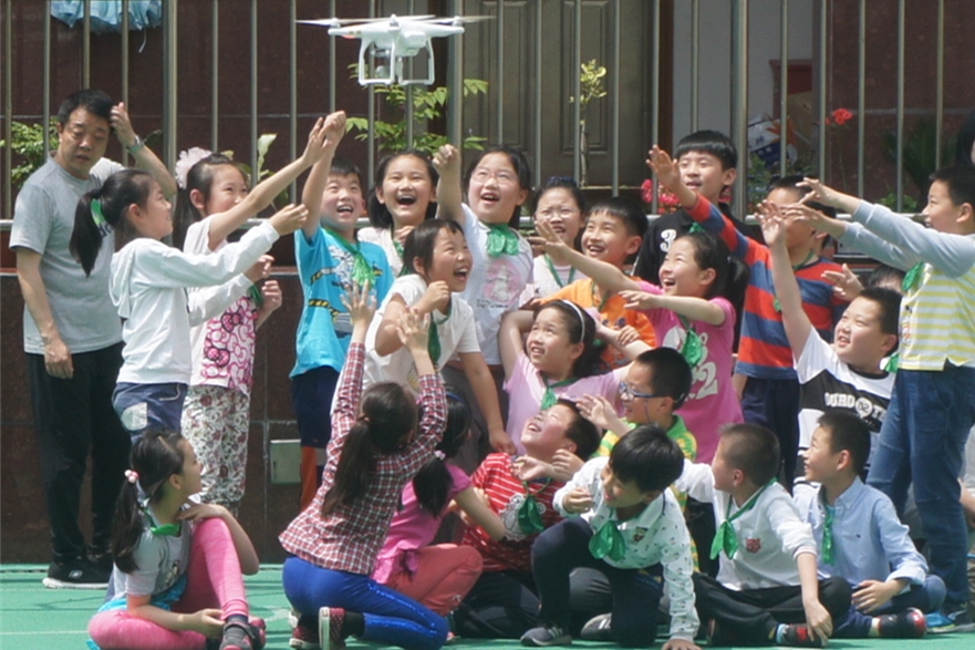 看过车模表演后,突然一艘怪怪的飞行器印入眼帘,它有四个角,四个角上各装有一旋翼,由电机分别带动,叶片可以正转,也可以反转。原来,它是类似于直升飞机的一种新型飞行器——四轴飞行器。飞行器掠过一二年级的上空时,都引来同学们欢呼声,有的甚至还想用手去抓!四轴飞行器空中优美的姿态为我们带来了惊喜,留给我们绚丽多彩的记忆。
